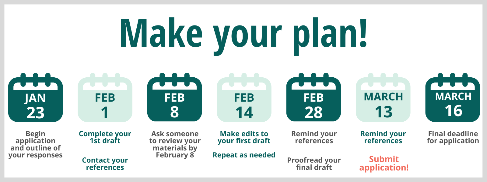 - Reference letters are required and are submitted alongside your application. You need to directly contact your references and have them send their letter to you, so you can upload it via the application. References letters can not be submitted by the person writing the reference. We encourage you to allow references ample time to complete their letters, and recommend a deadline of March 13 at the latest for uploading references to your application. Please note this significant change from previous years of scholarship applications.
